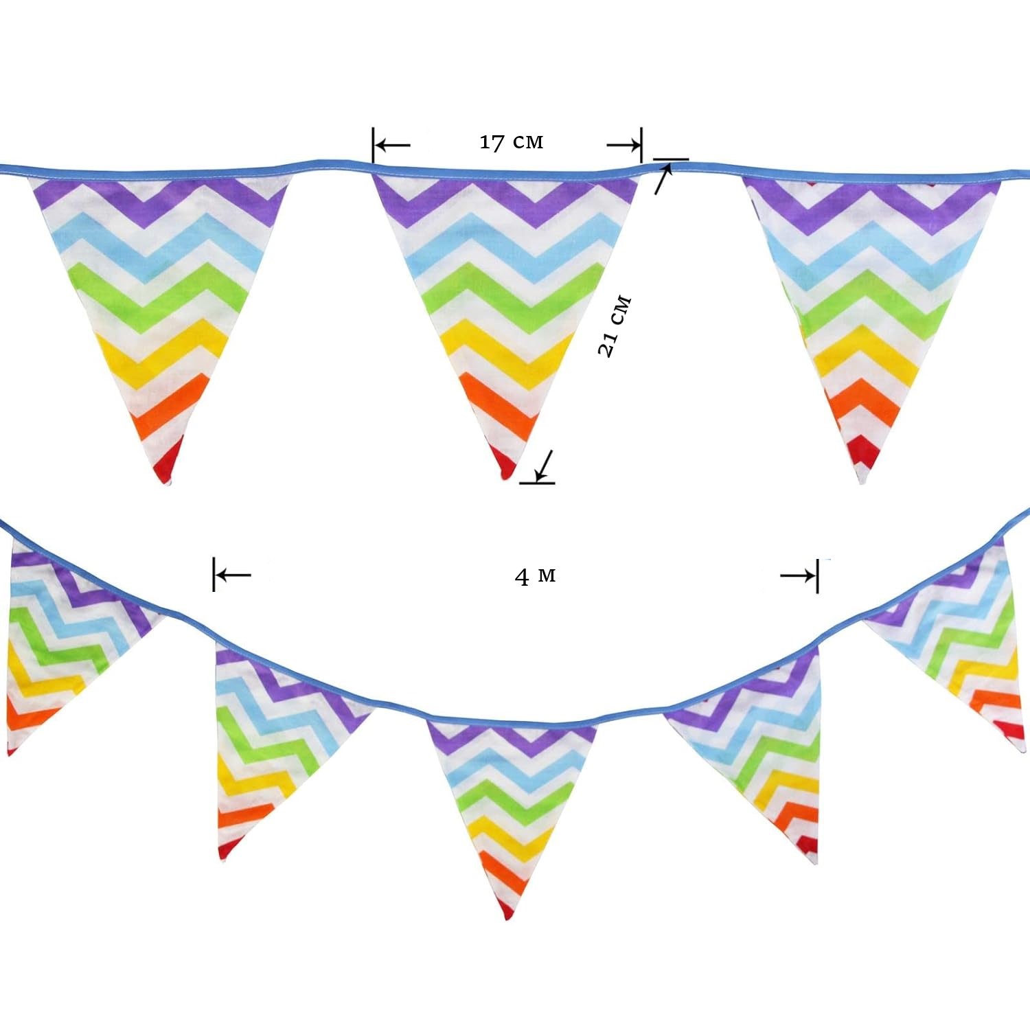 Гирлянда состоит из 12 флажков. Расстояние между флажками - 6 см, общая длина составляет 4 м.