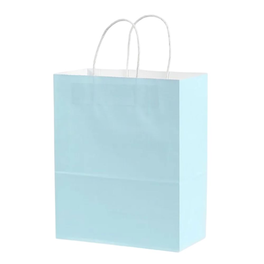 Подарочный пакет из крафтовой бумаги пастельного оттенка с белыми бумажными ручками и белой внутренней стороной.