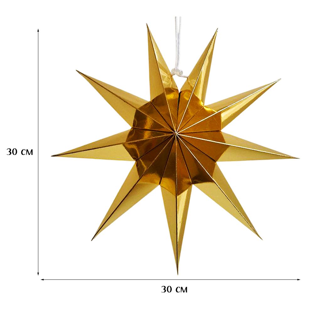 Объёмная декоративная звезда из картона диаметром 30 см с 9 лучами. Оснащена встроенным шнурком для подвешивания. Поставляется в компактном сложенном виде и быстро собирается: специальный шнурок при затягивании придаёт изделию объём и фиксирует форму. После сборки звезда остаётся устойчивой без дополнительных креплений и может использоваться многократно.