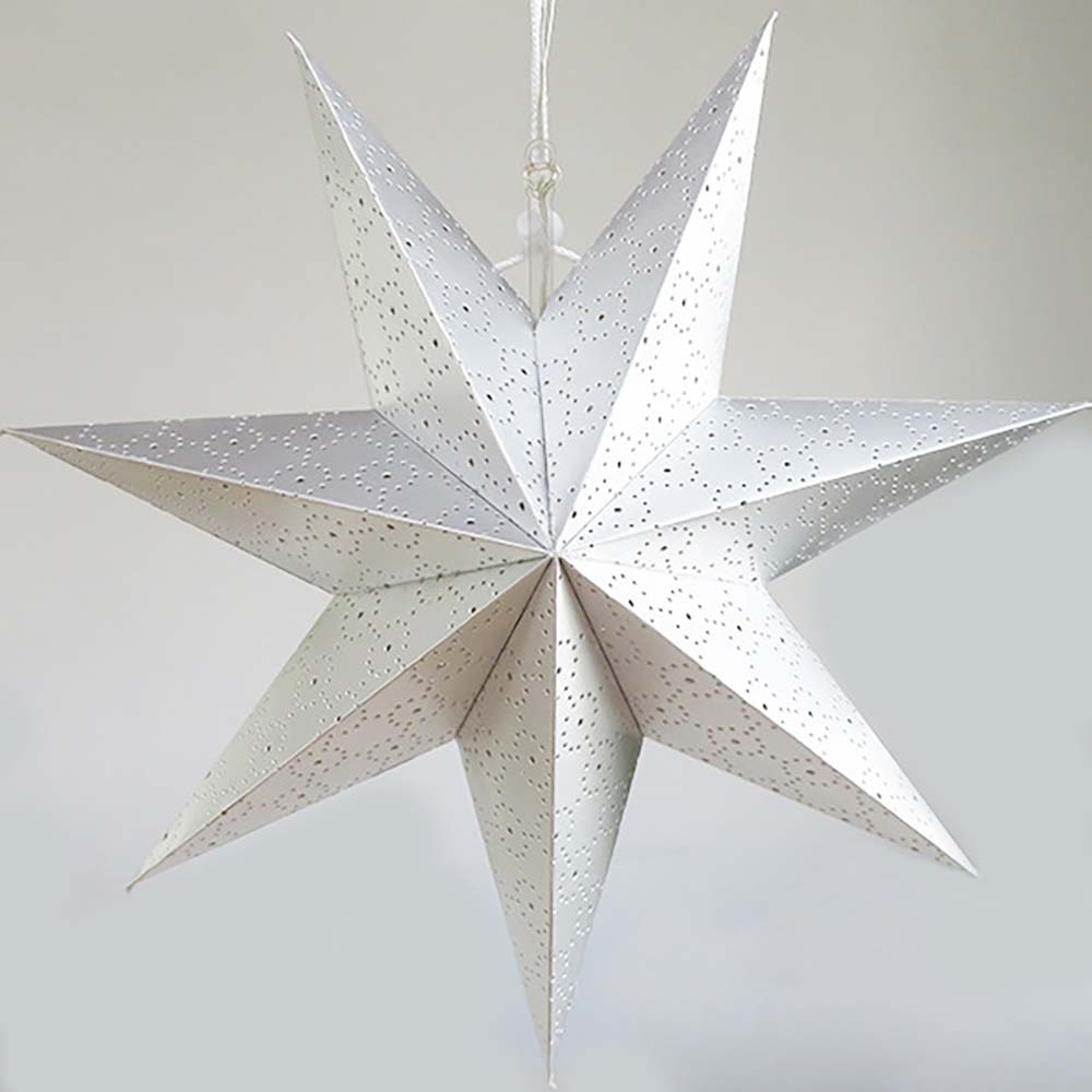 Семиконечная объемная звезда 45 см — великолепный декор из тонкого перфорированного картона. Создает красивые световые эффекты. Поставляется в сложенном виде, в комплекте шнур для фиксации объема и подвеса.